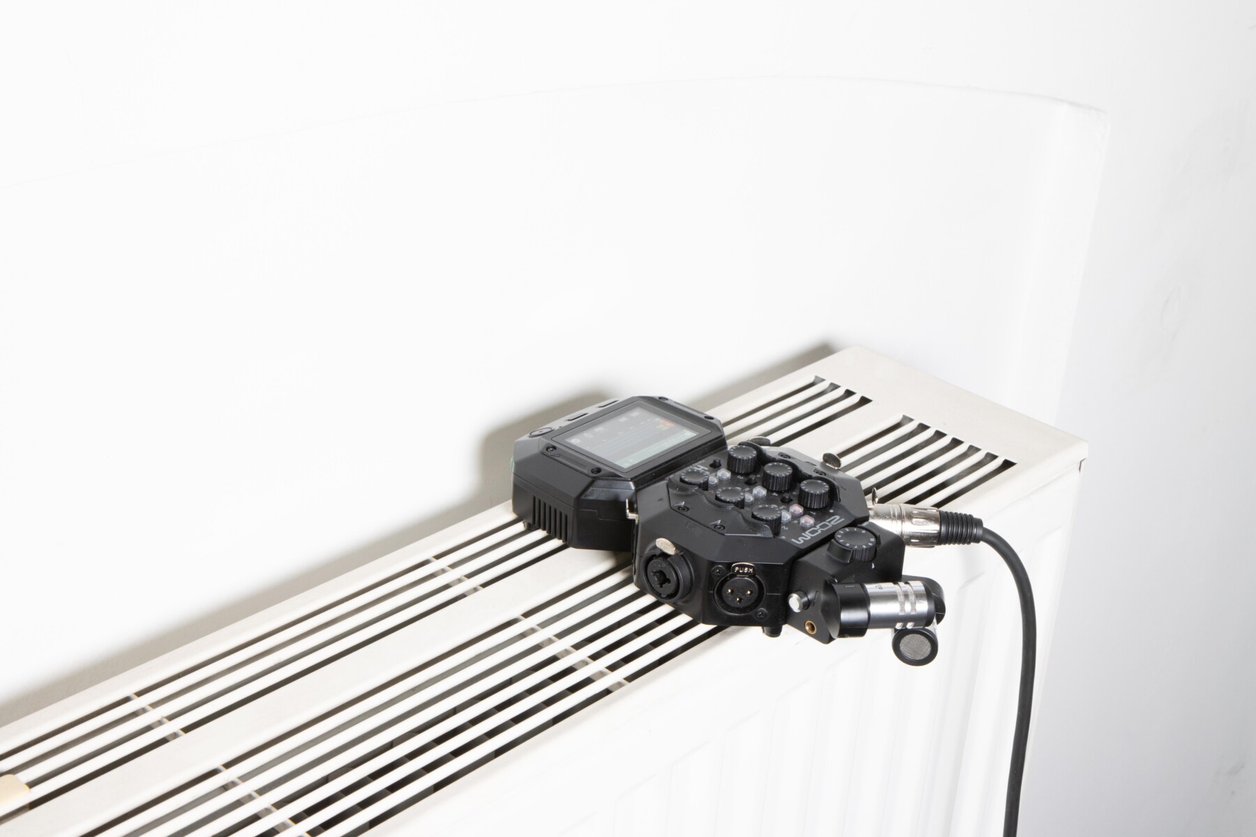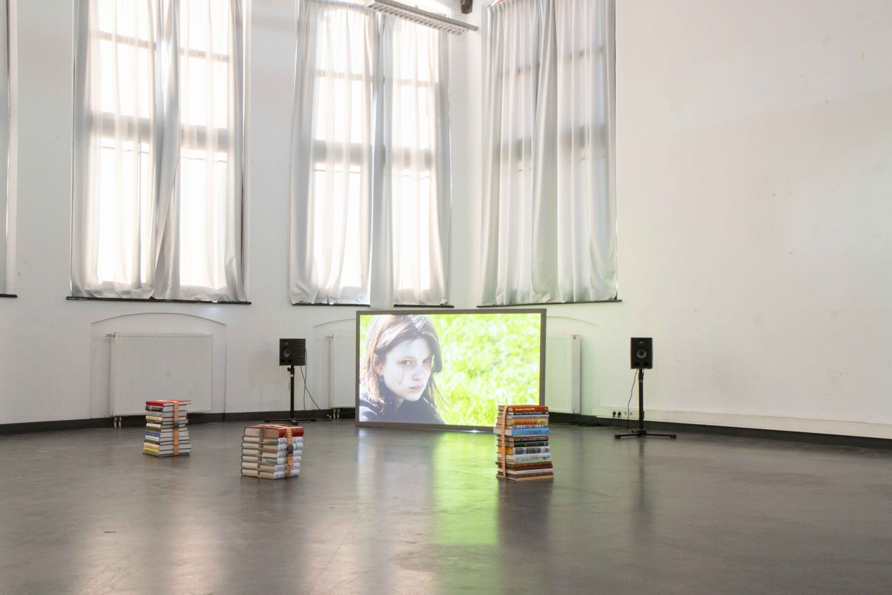 This is how Kaspar, an experimental play by Peter Handke from 1967, opens. It uses the figure of Kaspar Hauser — the boy who appeared in 19th-century Germany without language and without contact. He stammers and repeats a few sentences. “How someone can be made to speak through speaking... speech torture... a magic eye above the ramp.”With that same magic eye, we look at Lennert Lefever and his exhibition: a film screen, an A4 sheet on the ceiling, an apple with ‘einmalig’ carved into it, rotting in the corner, remnants of a film set, ‘re-enactment crew’ T-shirts, a triptych in the windows.