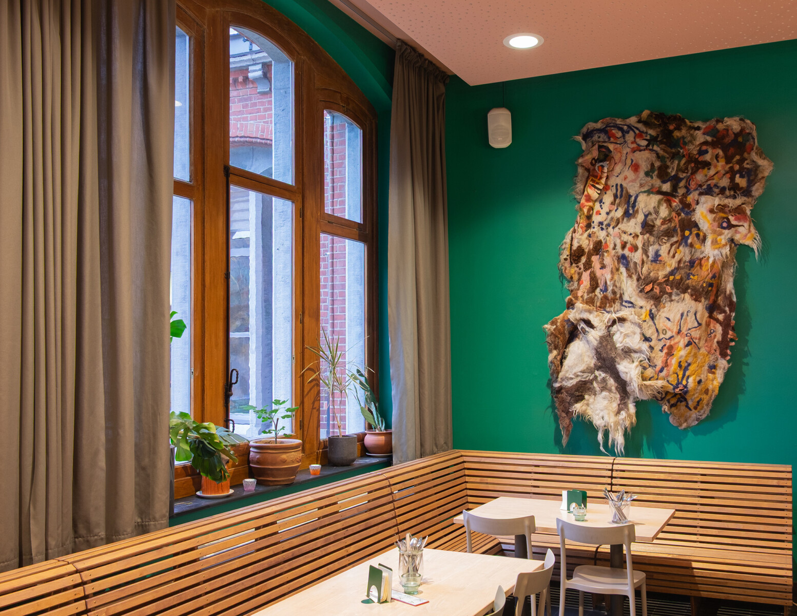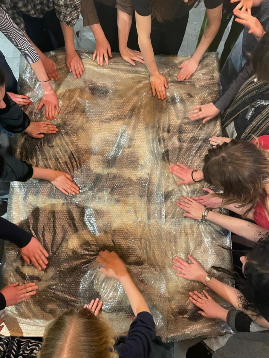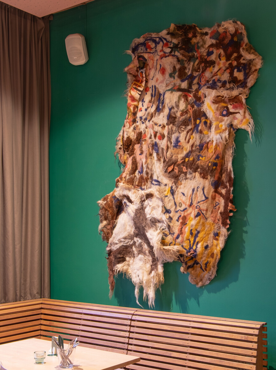 Oud-student Astrid Schouteden nodigde KASKcafé-bezoekers uit om een uniek viltwerk te creëren. Ervaren en onervaren vilters kwamen samen voor het maken van dit gezamenlijke kunstwerk.