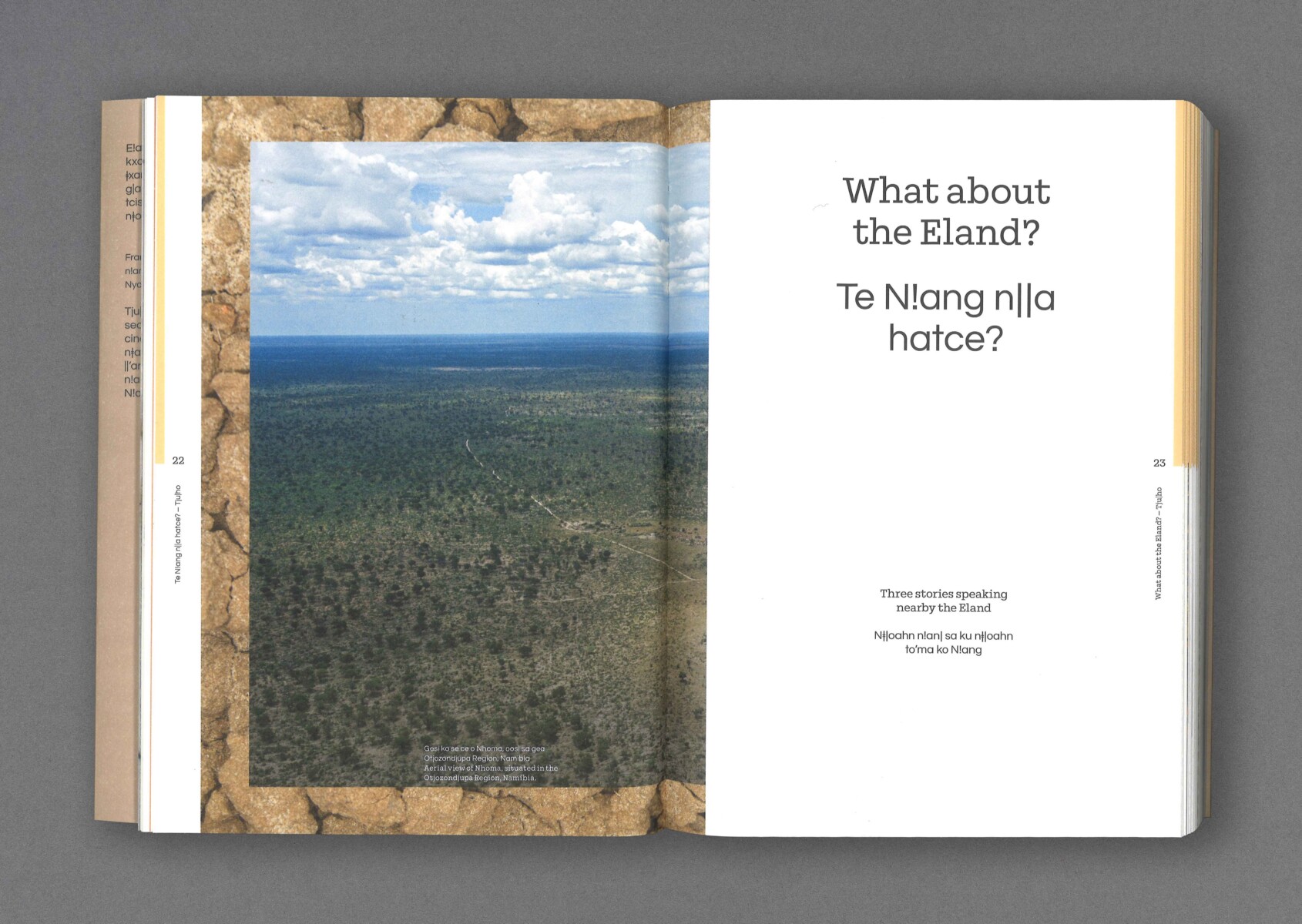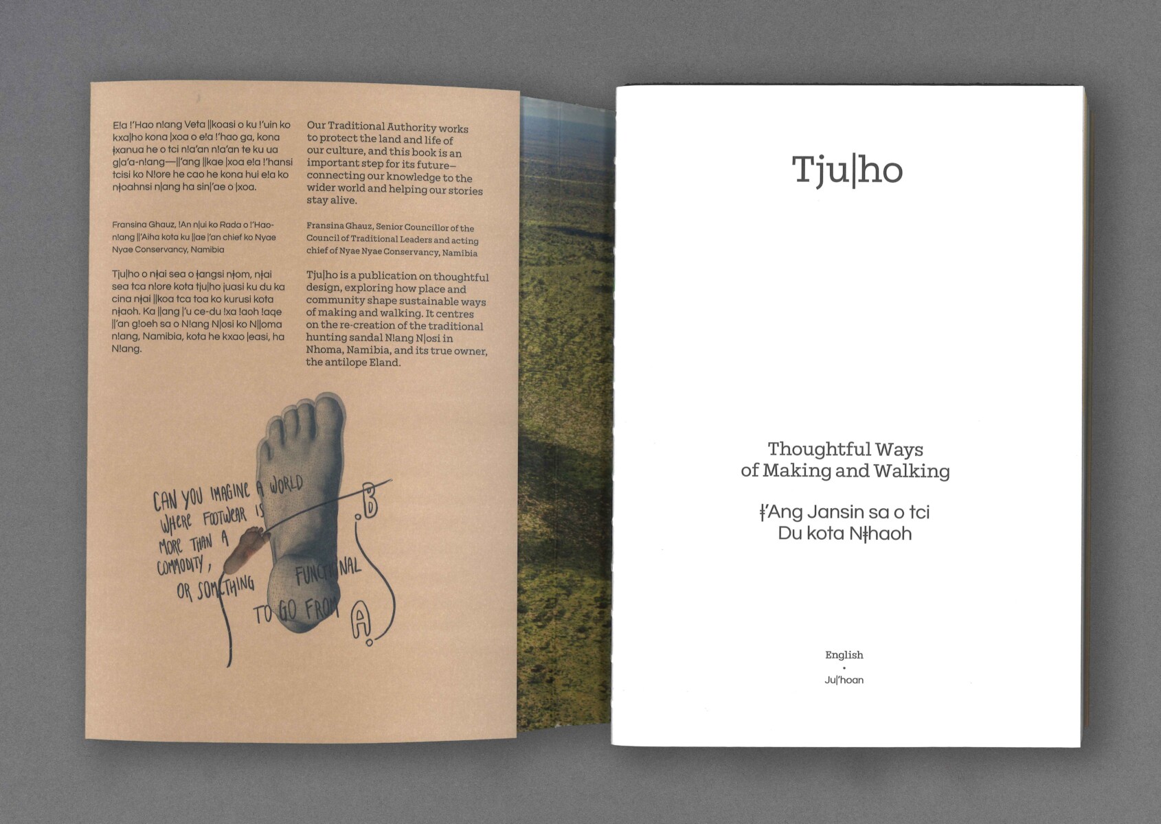 Tju|ho is een publicatie over doordacht design, waarin wordt onderzocht hoe plaats en gemeenschap duurzame manieren van maken en lopen vormgeven. Het richt zich op de herschepping van de traditionele jachtsandaal N!ang N|osi in Nhoma, Namibië, en de ware eigenaar ervan, de Eland.