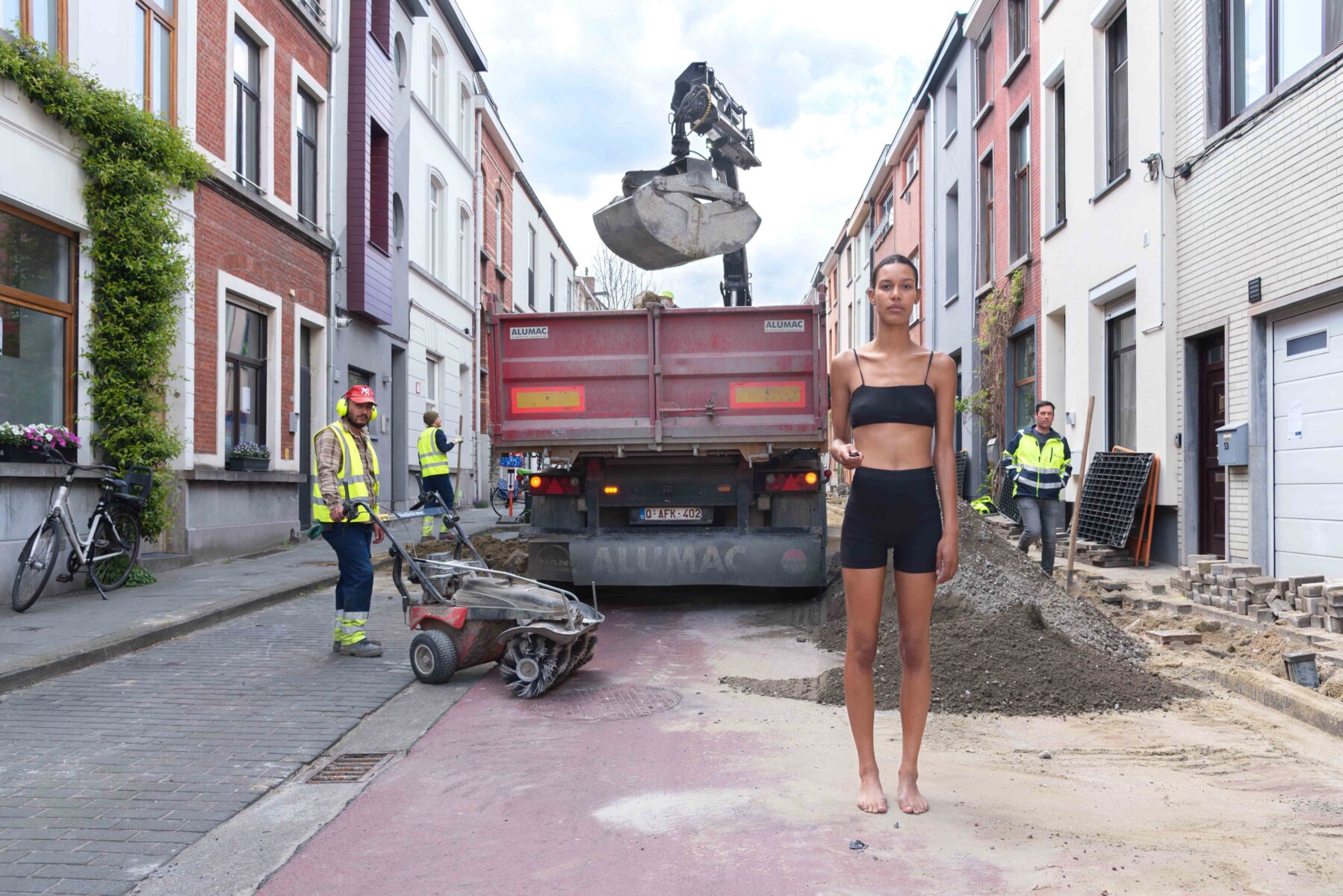 Ik wieg en kies mee kant in het afwisselend beschermen en afschermen, expliciet en impliciet, verkleinen en opblazen, relatie en dissociatie, introversie en extraversie, kaderen en selecteren. Ik raak samen met u zaken aan die moeilijk te verwoorden, maar wel heel scherp aan te voelen vallen. Ik pik in op de sabotage die het als een spel of sport neerzet. Jij stapt hun wereld in, met je blote huid als ultieme fragiliteit. De witte vlag wappert op het groene veld, contrasten blikkeren, zij witte polo’s, jij zwart ondergoed, wij die ons aanpassen aan de heersende normen van de omgeving. Hier de mechaniek van het kijken aan het werk. Ik voel de zorg van de automechanieker die je een proper vel papier gaf voor onder je voeten, maar denk ook het tegenovergestelde te zien in de pis die zijn weg zoekt tussen je tenen bij de vleeshandel en de sigarettenrook die over je lijf heen wordt geblazen. De rook zoekt zijn weg, zorgt voor waas, porie en korrel. Waar precies schuift die kwetsbare on voor de vrijheid en veiligheid, de enerzijds en wederzijds? Een man zat samen met een vriend aan de toog, maar de vriend stapte uit beeld en liet zijn volle pint staan? De kapper speelt zijn werk, er zijn geen klanten in beeld, er landt een speelse mop scheerschuim op je neus. Eén oog fixeert zich op je achterste. Er speelt zich veel in je rug af, muren trekken zich rond je op, een grijpkraan bengelt boven je hoofd. Je stuurt waar je iets aanvoelt, maar ik krijg het gevoel dat er hoe dan ook meer over je heen komt? Je (fotografie) dus meer loslaat dan vasthoudt, je daarbij je eigen poreuze studie-object wordt? Ik lees twijfel op je gezicht. Net dit niet-weten geeft gedeelde richting en doet me glimlachen.